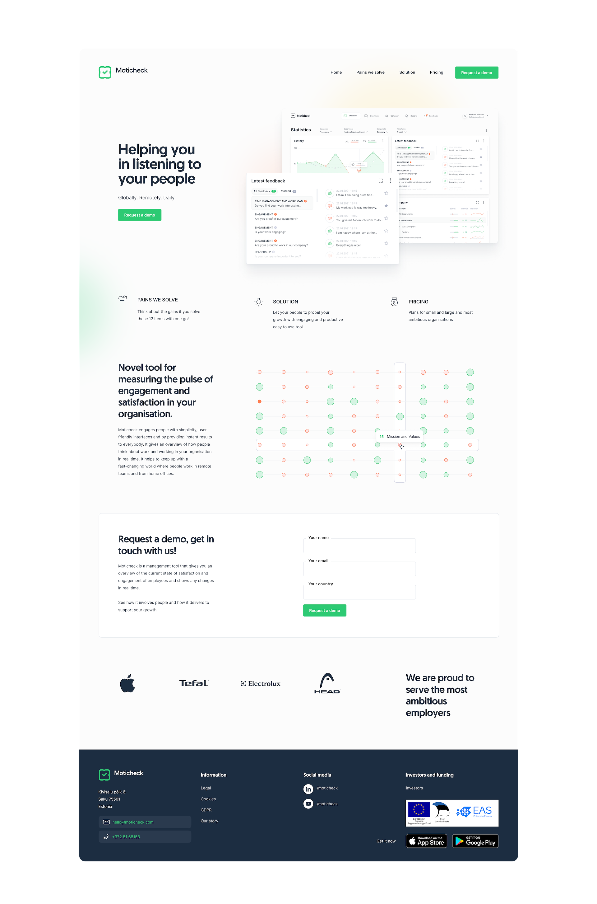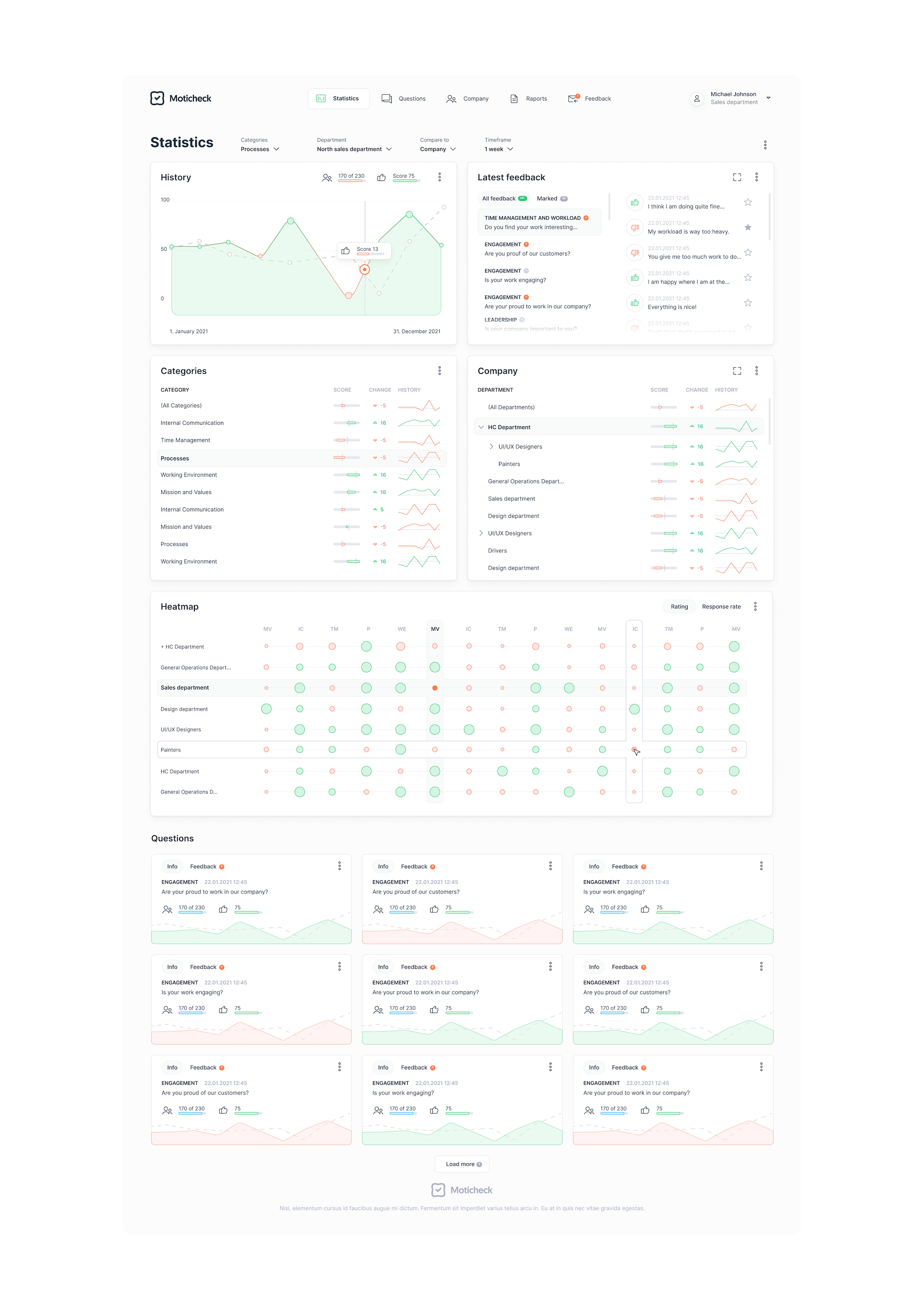 Moticheck kaasab inimesi lihtsuse, kasutajasõbralike liideste ja kõigile koheselt kättesaadavate tulemuste kaudu. See pakub reaalajas ülevaadet töötajate arvamusest töö ja töötamise kohta teie organisatsioonis – temperatuurimuutused meeskondades on kiirelt märgatavad. Suisa visuaalselt.