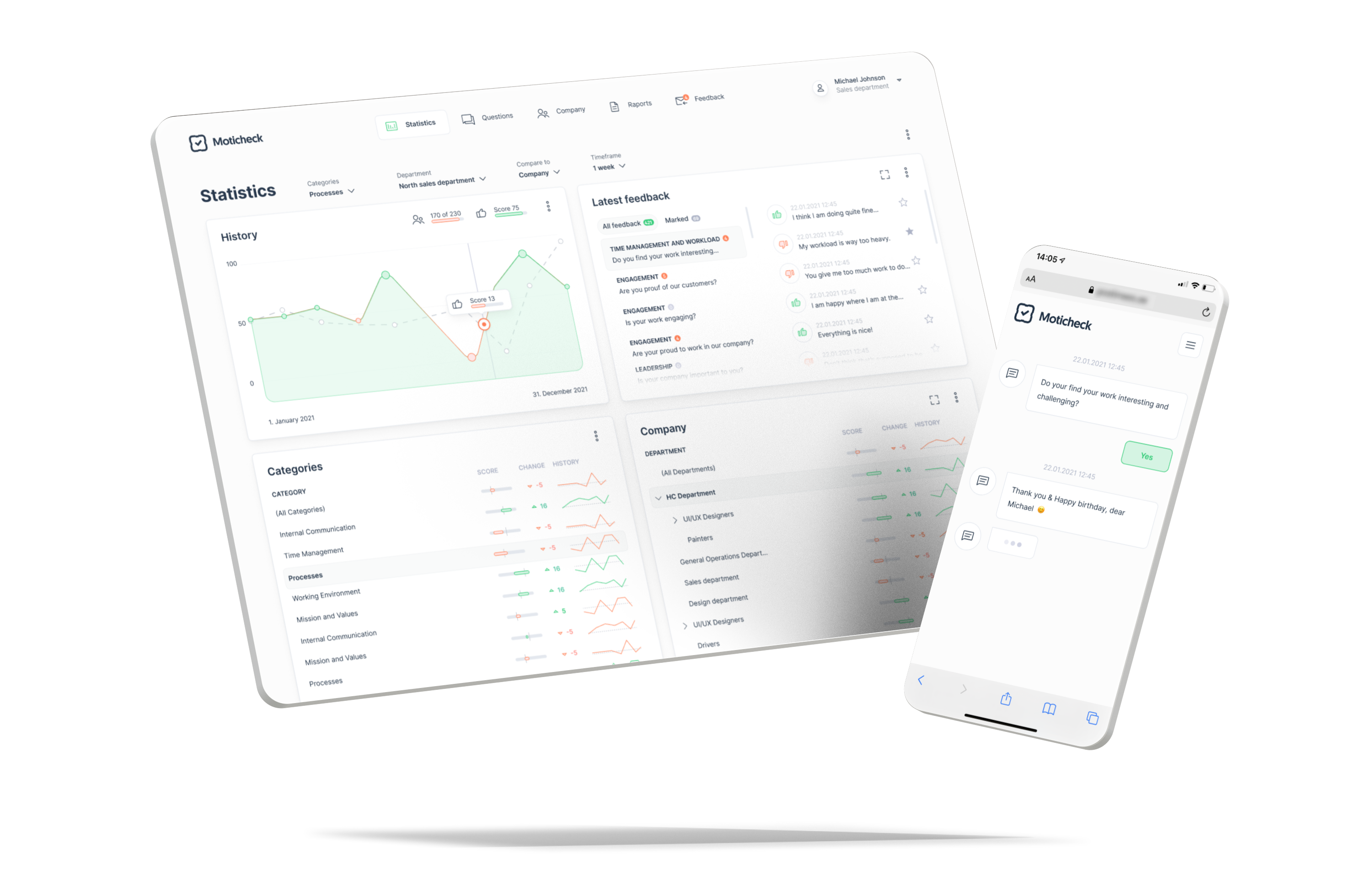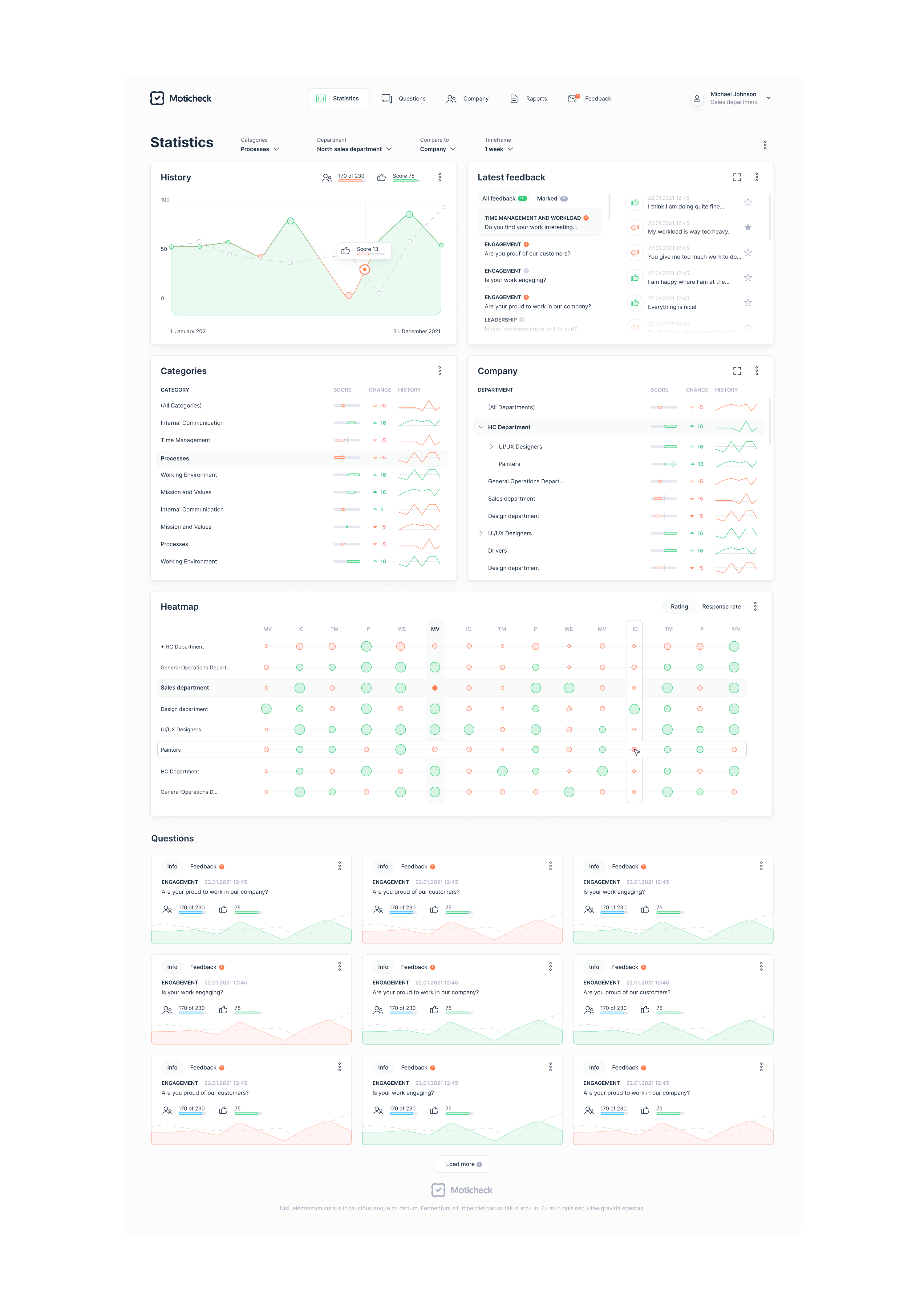 Moticheck kaasab inimesi lihtsuse, kasutajasõbralike liideste ja kõigile koheselt kättesaadavate tulemuste kaudu. See pakub reaalajas ülevaadet töötajate arvamusest töö ja töötamise kohta teie organisatsioonis – temperatuurimuutused meeskondades on kiirelt märgatavad. Suisa visuaalselt.